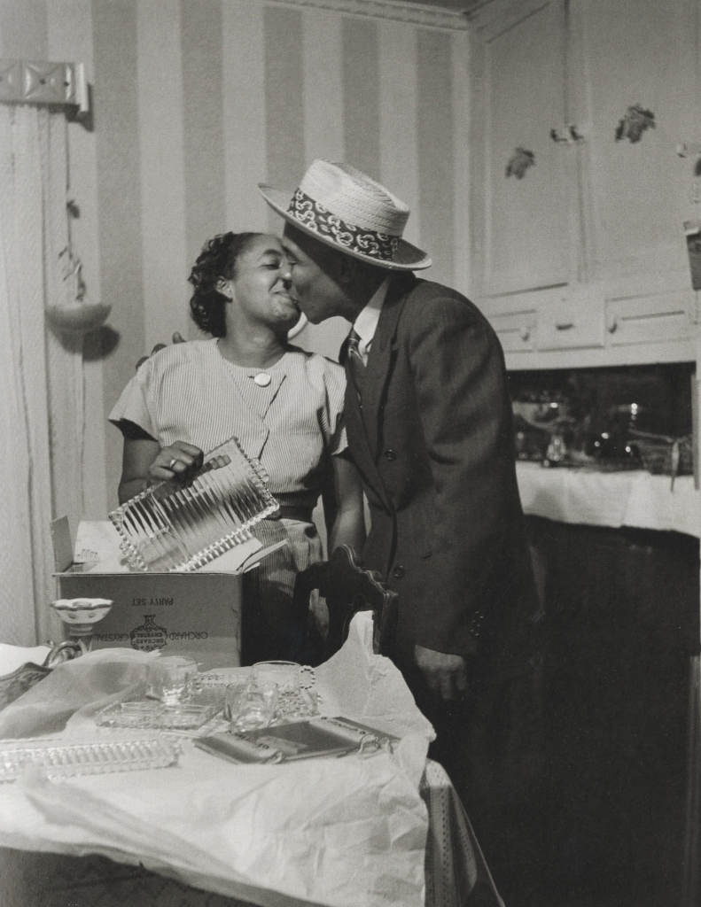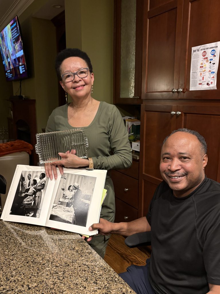 (Photo Left to Right) Kirk Sharp and Cheri Dixon at her home in Smyrna, GA, holding one of the dishes and the book Back to Fort Scott which features the 1950 photograph taken by Gordon Parks in the home of her grandparents, Louella and Clarence Hill, while her grandmother is holding one of the same dishes. The photo below is an image of the photo that Gordon Parks took in 1950.