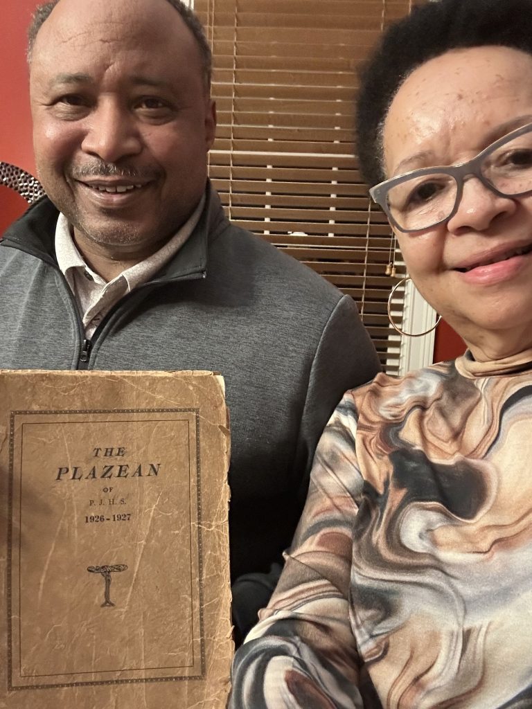 (Left to Right) Kirk Sharp and Cheri Dixon at her home in Smyrna, GA, holding the 1926 Plaza School Year book.