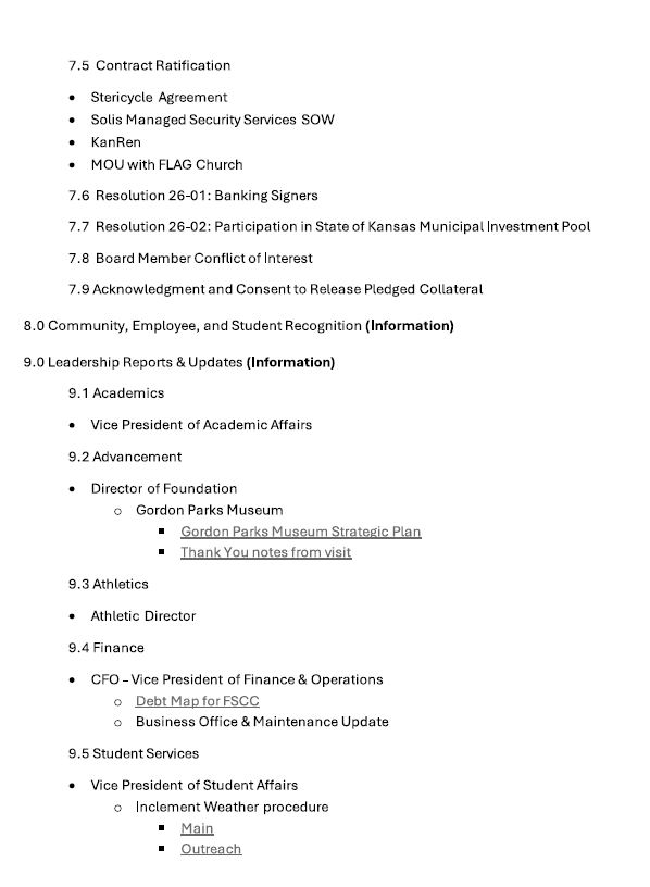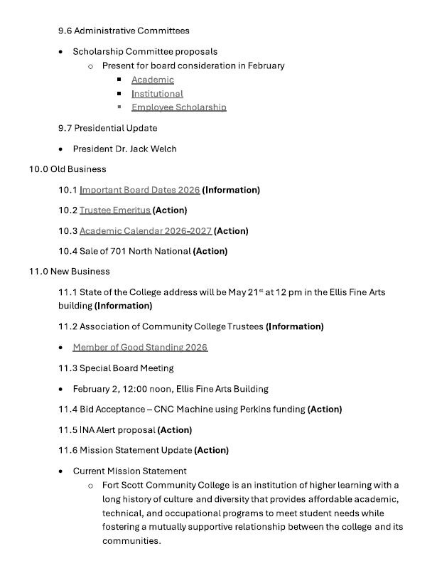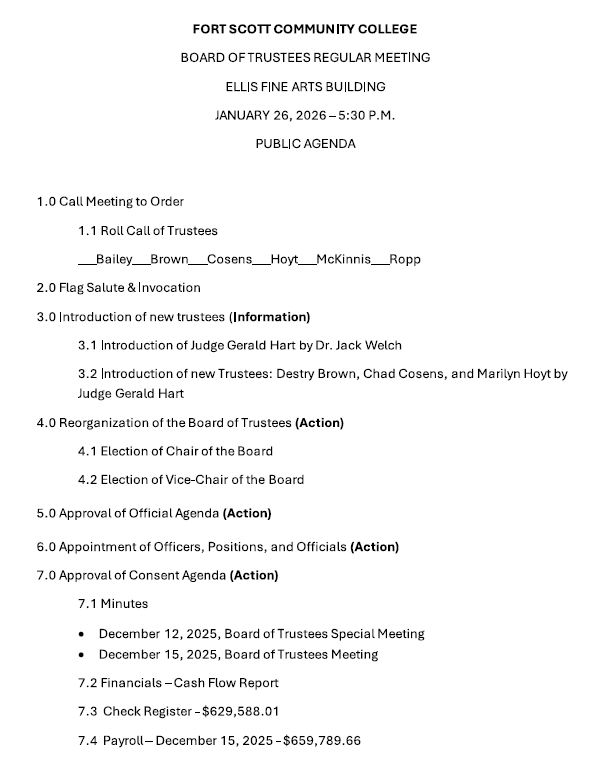 Fort Scott Community College, Government Agenda for the FSCC Trustees on Jan 26 January 23, 2026 Submitted Story Leave a comment Related