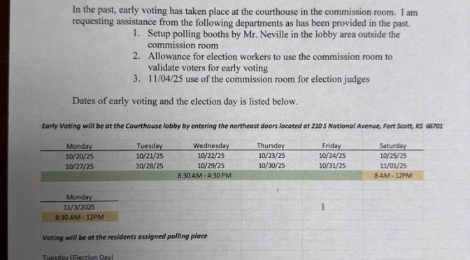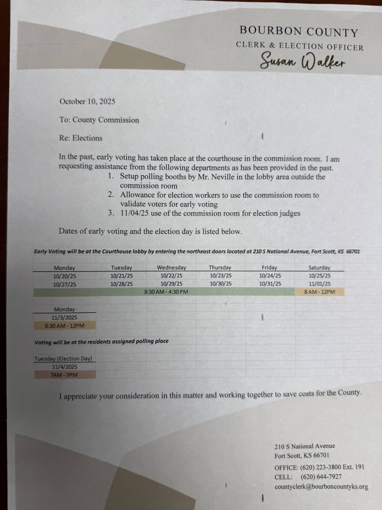 On October 25th, 2025, early voting was taking place at the Bourbon County Courthouse. The hallway outside the commission meeting room held voting booths, and the commission meeting on the North side of the hallway was being used as an area to validate voters and deal with provisional ballots. The use of the areas was described in a memo written by the Clerk on October 10th and discussed at the October 14th commission meeting.