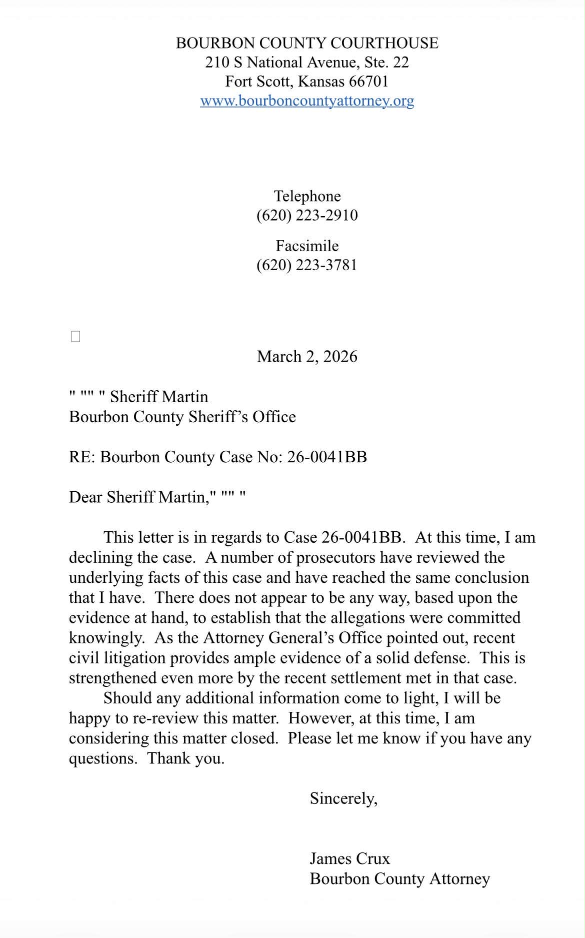 Letter from James Crux, Bourbon County Attorney, RE: Case 26-0041BB, declining to prosecute — citing inability to prove the allegations were “committed knowingly” and the civil settlement as providing “ample evidence of a solid defense.”