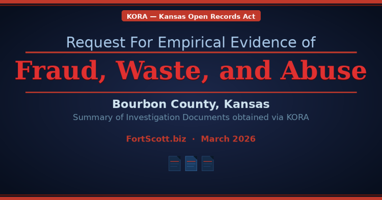Commissioner Samuel Tran publicly stated he had “empirical evidence” of fraud, waste, and abuse in Bourbon County government. This generated significant public interest in what that evidence was and whether it would lead to prosecution. The documents in this summary are those obtained by KORA request for that evidence.