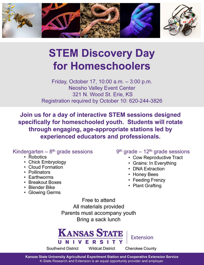 Erie, KS – Area Homeschool families are invited to participate in a day of hands-on science learning at the upcoming STEM Discovery Day for Homeschoolers on Friday, October 17, from 10:00 a.m. to 3:00 p.m. at the Neosho Valley Event Center, 321 N. Wood St., Erie, Kansas.