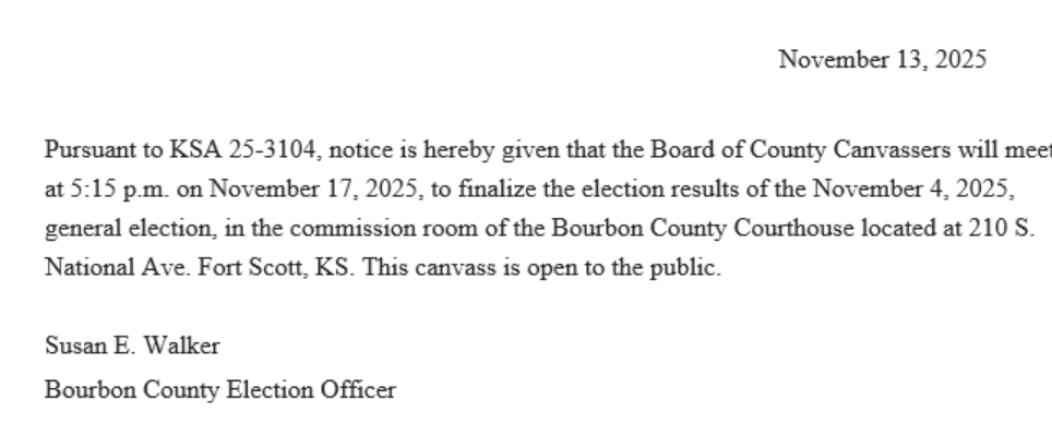 CANVASS: KSA 25-3101, 3104 & 3107 Monday, November 10, 2025 at 10:00AM in the Commission Room of the Bourbon County