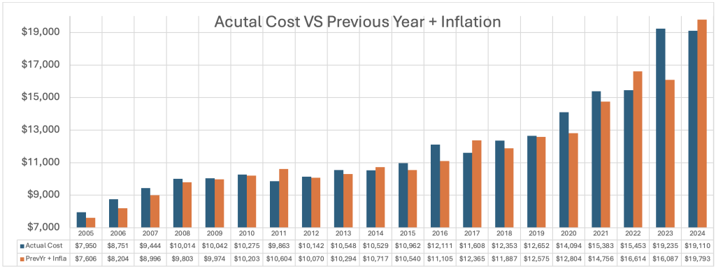 Now, let’s talk about where we are vs inflation in a way that we can see some meaningful data. In the chart below I looked at spending over the last 20 years (blue) and compared it to what the spending would have been if the only thing we considered was the previous year’s spending and adding in inflation (orange). This gives us a clearer picture of what inflation increases would have been year over year vs the actual increases and illustrates what years had increases beyond inflation.