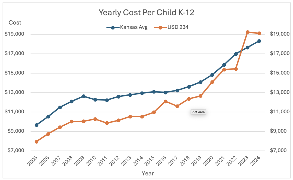 Let’s look at another important perspective: Where is Fort Scott vs other schools in the state. In the next graph I compared USD 234 spending to the average school district spending in the state of Kansas. Until we received those 2023 ESSER funds, we were consistently below the state average in per child spending. In 2024 spending went down for us and up for the rest of the state so we very well could be below the average again in the next year or two.