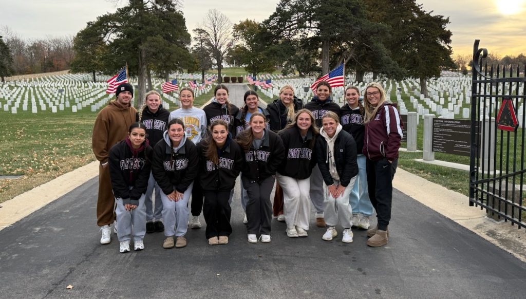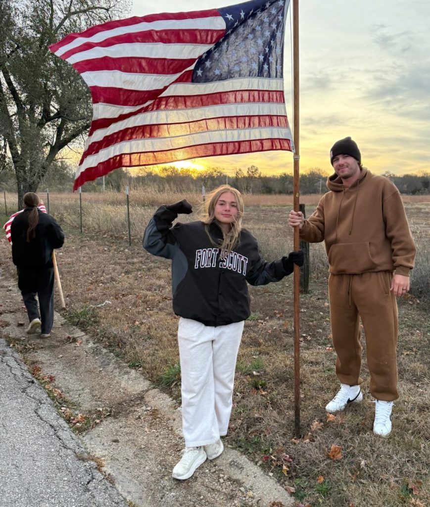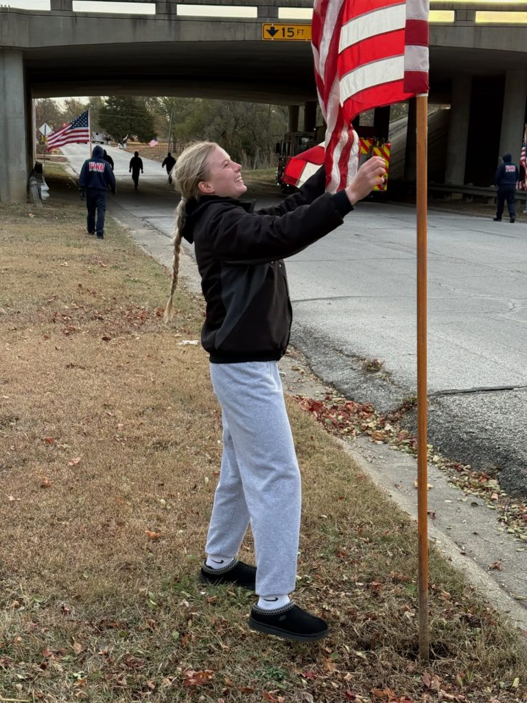The Fort Scott Chapter of the Veterans of Foreign Wars organization, the Fort Scott Fire Department, Fort Scott Community College Softball Team members and other volunteers, placed American flags on National Avenue that leads into the national cemetery.
