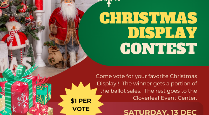Christmas Display Competition – Come vote for your favorite Christmas Display. Votes are $1 each, with a portion of the sales going to the winners and the Cloverleaf Event Center.