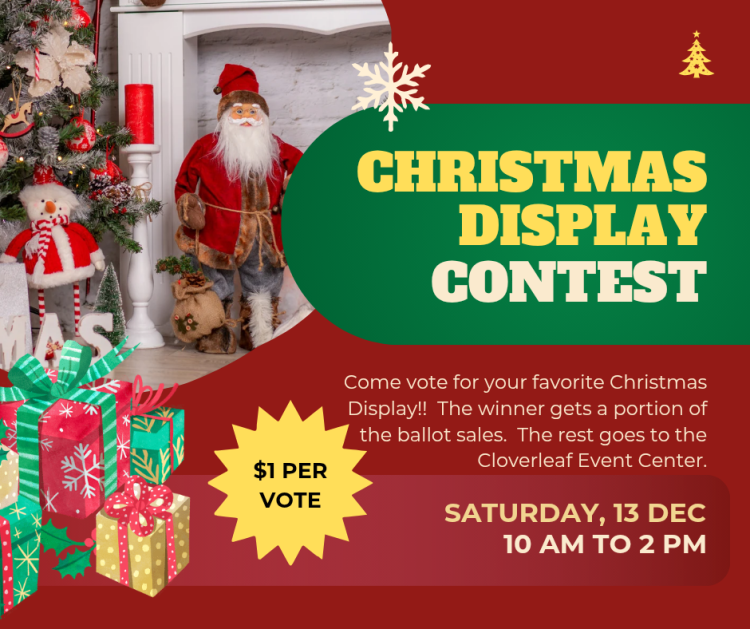 Christmas Display Competition – Come vote for your favorite Christmas Display. Votes are $1 each, with a portion of the sales going to the winners and the Cloverleaf Event Center.