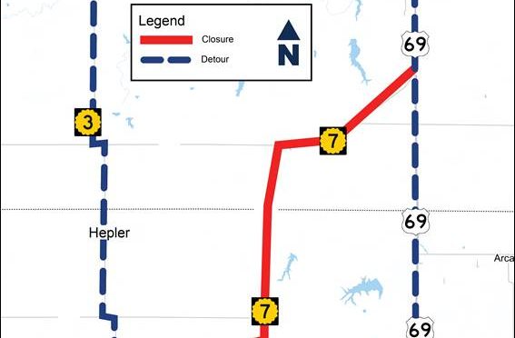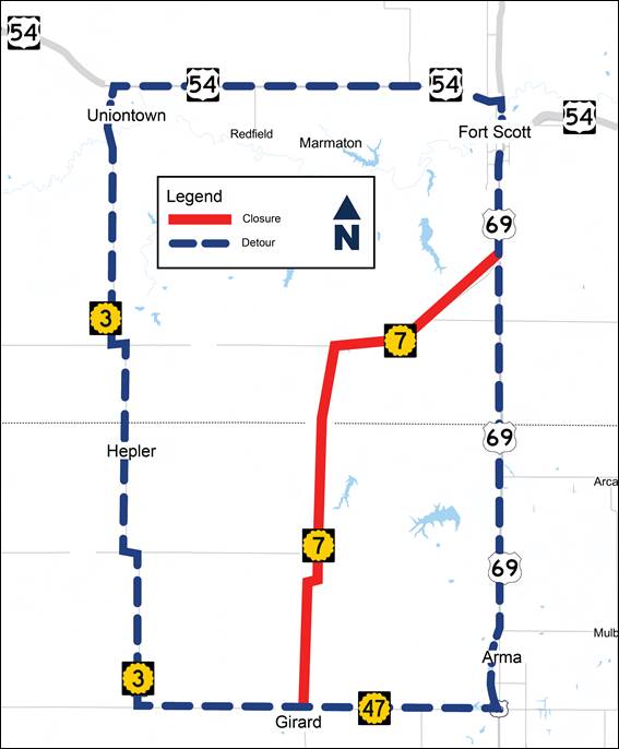 The K-7 closure was made to address safety concerns at the intersection of K-39 and K-7, which is undergoing reconstruction. Traffic is following a signed state detour on U.S. 69, K-47, K-3 and U.S. 54.