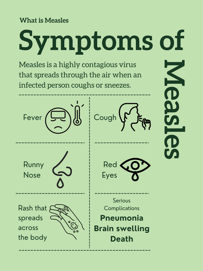 Symptoms typically begin with a high fever, cough, runny nose, and red, watery eyes, followed by a distinctive red rash that spreads across the body. Measles can lead to serious complications, including pneumonia, brain swelling (encephalitis), and even death, particularly in young children, pregnant women, and those with weakened immune systems.