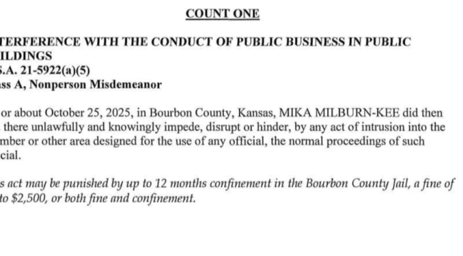 The State of Kansas has filed a criminal charge against Mika Milburn-Kee in Bourbon County District Court. The complaint, filed on March 24, 2026 by Assistant Attorney General Olivia R. Higdon of the Criminal Division’s Economic Crimes unit, stems from an incident that allegedly took place on October 25, 2025 in Bourbon County.