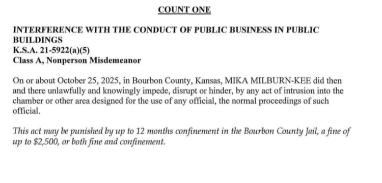 The single count charges Milburn-Kee with Interference with the Conduct of Public Business in Public Buildings under Kansas statute K.S.A. 21-5922(a)(5). This law makes it a crime to knowingly disrupt, impede, or hinder the normal work of a government official by intruding into a chamber or area set aside for that official’s use. The state alleges that is what Milburn-Kee did on that date. This appears to be related to areas designated for use in the election that was underway at the time.