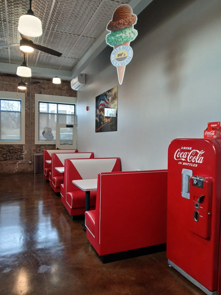 Lu’s Ice Cream Shop has vintage-type furniture and one true vintage Coke machine. A customer on their birthday can get one free bottle of Coke, with a special token provided by the shop.