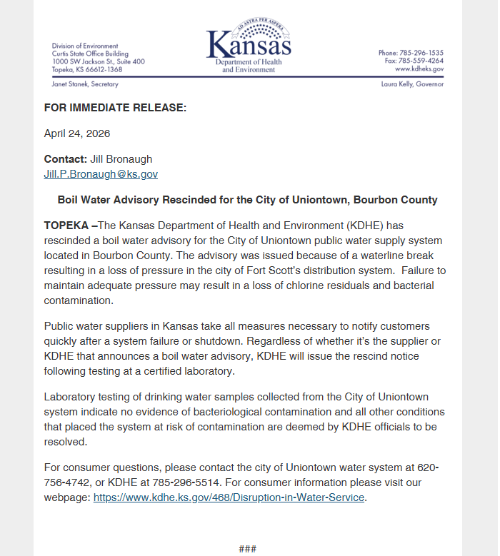Bourbon County, Government, Health Care The Water Boil Order Is Lifted For Uniontown, KS April 24, 2026 Loretta George Leave a comment Related