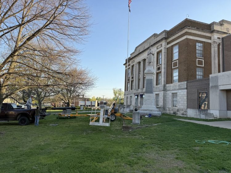 Next time you happen to be down by the courthouse, be sure to glance up at the Union Soldier Statue. You’ll find a cleaner version of the tribute to volunteer soldiers who fought in the Civil War than the last time you looked his way. Workers used a lift and pressure washer to give him a bath on Friday evening.